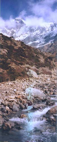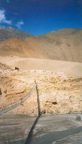 One of many bridges crossing the rivers that cut through the himalayan mountains.