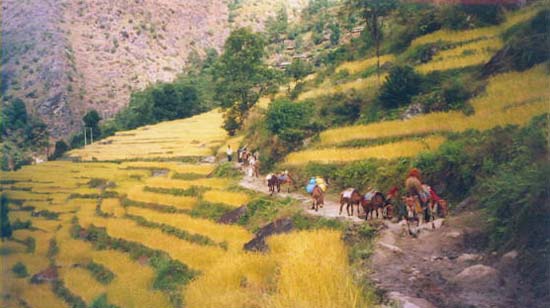 A pack of donkeys (mules, maybe?) carrying supplies on the paths through terraced rice fields.