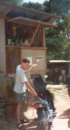 May 27 - Ko Pha Ngan, Thailand. I rode all over the island on this bike. A typical gas station on the island - you can't see the barrel of gas, but you can see the glass measuring cylinder above it. A handle is cranked to transfer gas into the measuring cylinder, then the cylinder is drained via the hose. Not quite like the Esso station.