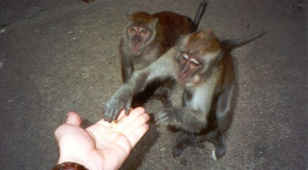 April 26 - Kuala Lumpur, Malaysia. Hand feeding some wild monkeys at the Batu Caves, just north of the city.