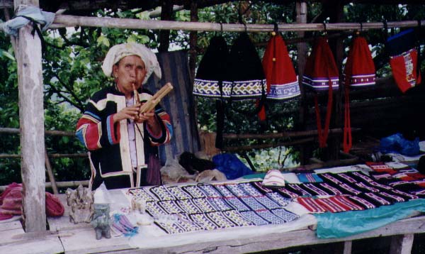 One of the hilltribes women selling her crafts at the peak of a mountain road. She's playing this funny instrument that sounded like a non-threatening version of the bagpipes.