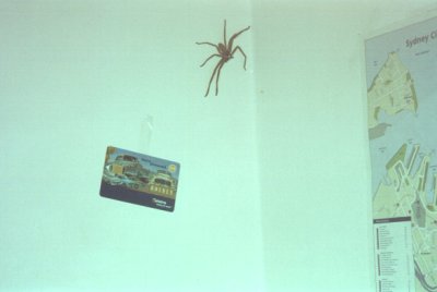 I found this Huntsman Spider in my livingroom on a drunken St. Patrick's Day eve. Beside him is a phone card I'd taped to the wall. You can see the spider is about the same size.