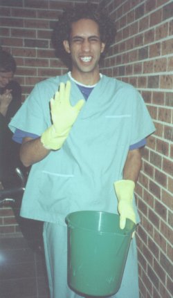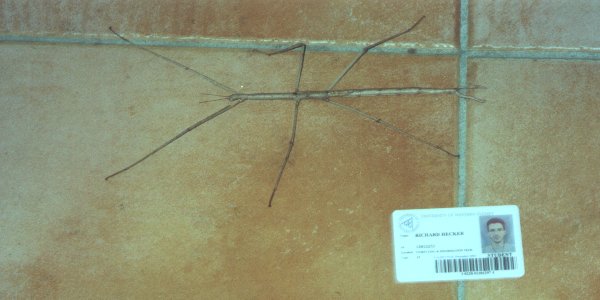 Mr. Stickey, the Stick-Bug that made a number of appearences on various balconies in Harris Park. That's my student ID card next to him - you can see that he's about 10 inches (25cm) long.