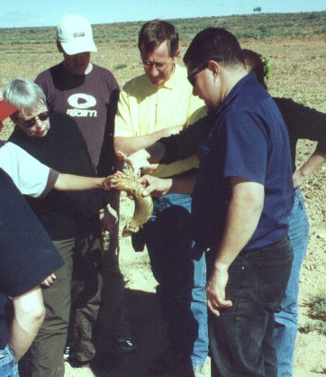 Every now and then Bill would see some sort of animal while driving and he would bring the bus to a sudden halt on the side of the road. He would then jump out of the bus and grab what he'd spotted. In this case, it was a stumpy-tailed lizard.