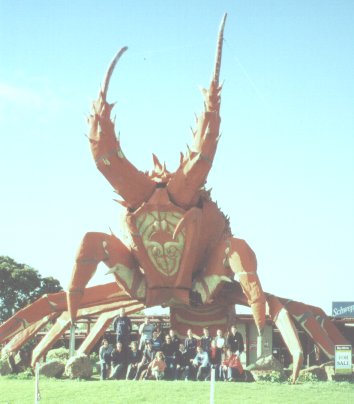 On the way to Adelaide, the Oz Experience bus passengers pose with Larry the Lobster. Our driver had to go across the street to take the picture and get it all in.